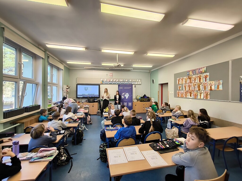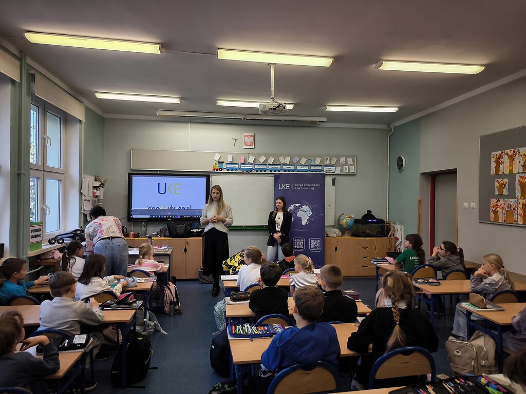 Podczas wizyty w Szkole Podstawowej nr 13 im. Orląt Lwowskich w Szczecinie, pracownicy UKE rozmawiali z najmłodszymi użytkownikami urządzeń telekomunikacyjnych z klas 2-3 o bezpiecznym poruszaniu się w sieci i korzystaniu z tych urządzeń. Wyjaśniali jak ważne jest wchodzenie tylko w zaufane linki i strony internetowe, aby uniknąć szkodliwych treści lub cyberataków. Omawiali możliwe konsekwencje udostępniania informacji online, w tym zdjęć, lokalizacji czy danych osobowych. Rozmawiali także o cyberprzemocy i uczyli jak zgłaszać lub blokować osoby, które ich prześladują online. Na zakończenie dzieci otrzymały dyplomy za aktywne uczestnictwo. W spotkaniu wzięło udział ponad 70 osób.