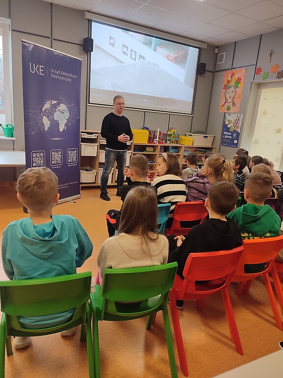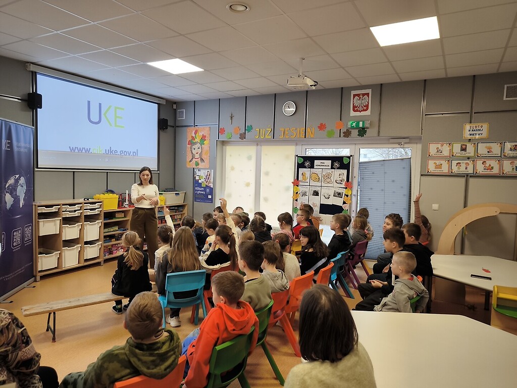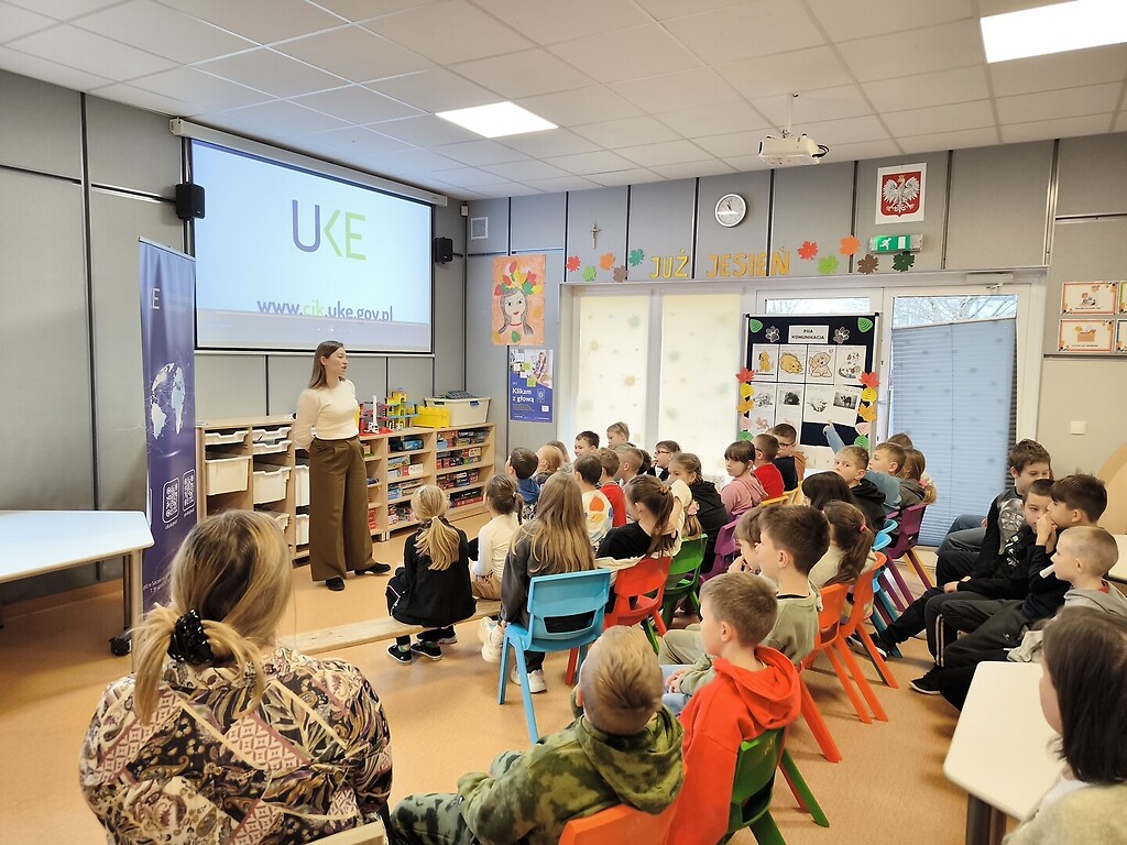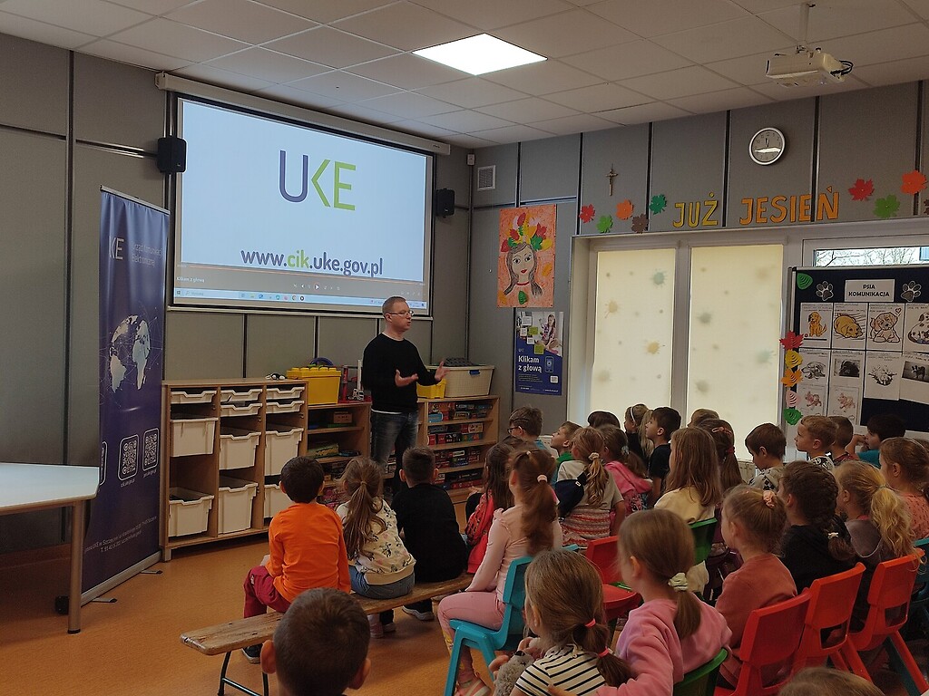 Podczas wizyty w Szkole Podstawowej nr 3 im. Marii Skłodowskiej-Curie z Oddziałami Dwujęzycznymi w Policach, pracownicy UKE rozmawiali z użytkownikami urządzeń telekomunikacyjnych z klas 1-3 o bezpiecznym poruszaniu się w sieci i korzystaniu z tych urządzeń. Wyjaśniali jak ważne jest wchodzenie tylko w zaufane linki i strony internetowe, aby uniknąć szkodliwych treści lub cyberataków. Omawiali znaczenie tworzenia silnych, unikalnych haseł i przedstawiali ryzyko ich udostępniania. Wskazywali na możliwe konsekwencje udostępniania informacji osobistych online, w tym zdjęć, lokalizacji czy danych osobowych. Rozmawiali także o cyberprzemocy i uczyli jak zgłaszać lub blokować osoby, które ich prześladują online. Na zakończenie dzieci otrzymały dyplomy oraz drobne upominki za aktywne uczestnictwo. W spotkaniu wzięło udział ponad 120 osób.